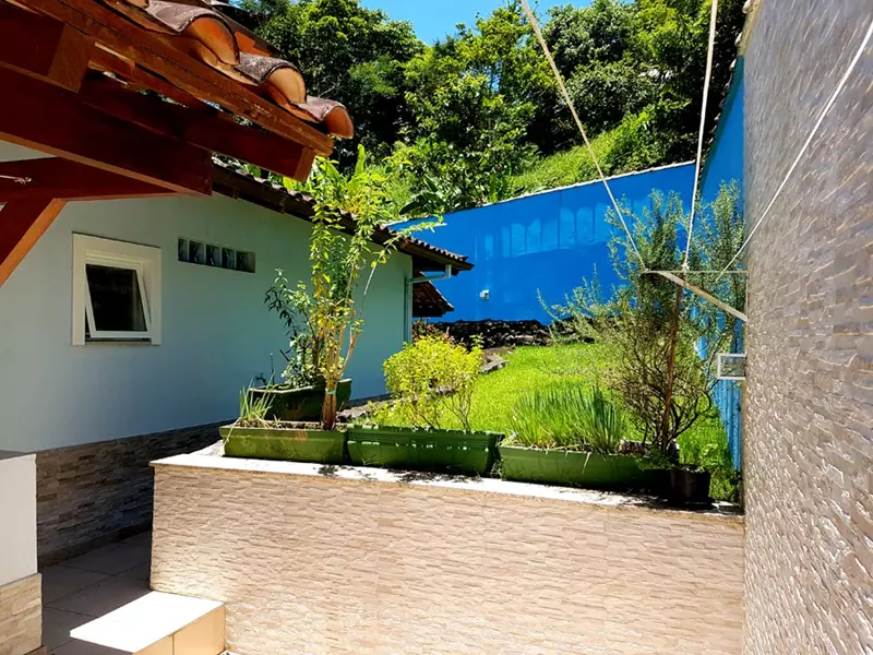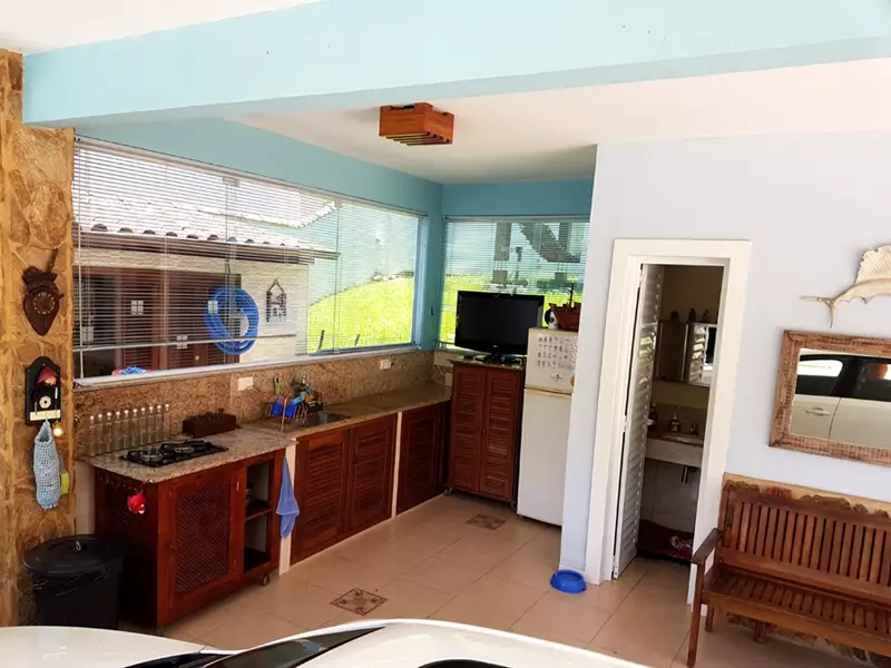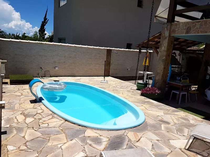 Dispõe de um amplo quintal todo gramado cercado de muito verde, garagem coberta, uma linda piscina, 1 cômodo para guardados, área gourmet e 1 lavabo em sua área externa.