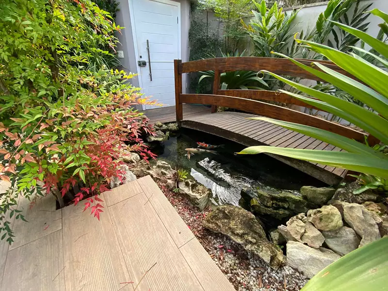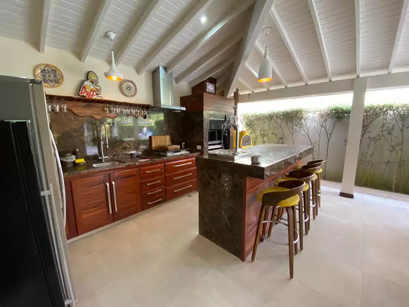 Construída com madeiras nobres, pedras selecionadas (cozinha em mármore Carrara), moveis planejados e amplas portas e janelas envidraçadas que dão visão para o exuberante jardim, área gourmet completa, piscina, sauna e lago.