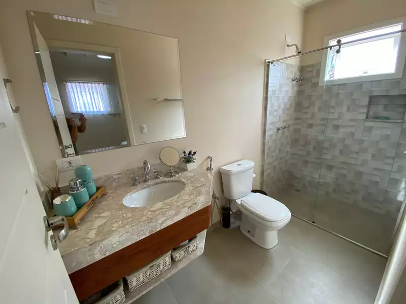 A casa possui três lindas suítes no andar superior e uma suítes com varada e jardim privativo no andar térreo. Salas de estar e TV, cozinha integrada com sala de jantar, escritório, lavabo, área de serviço completa e banheiros completo para atender a área externa.
