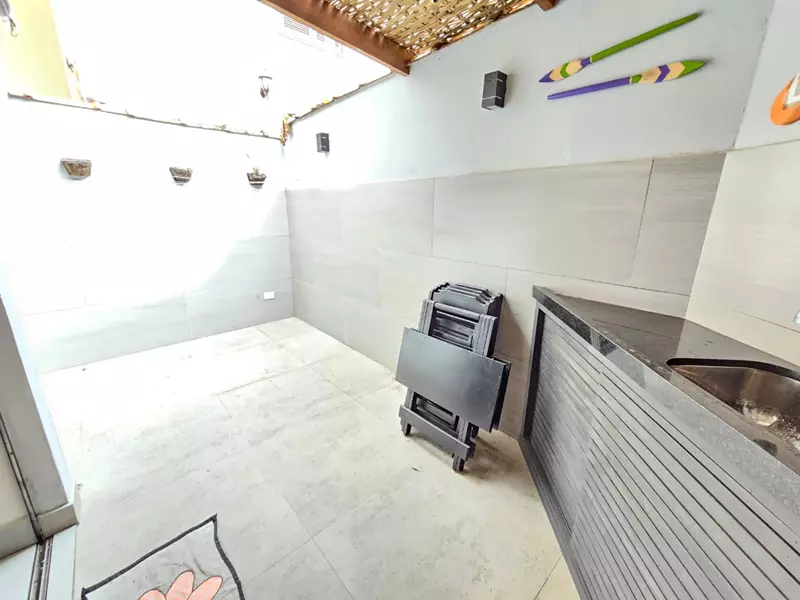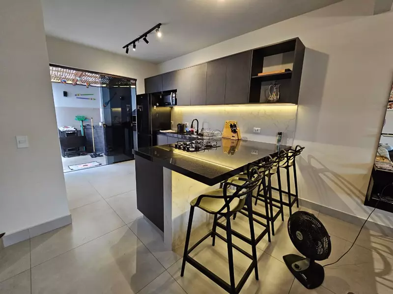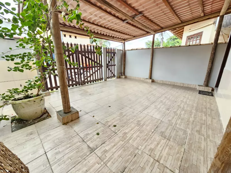 2 quartos sendo um deles possuindo closet com sacada, 2 banheiros sociais, sala, cozinha, área de serviço, pequeno quintal com garagem coberta, possuindo escritura.