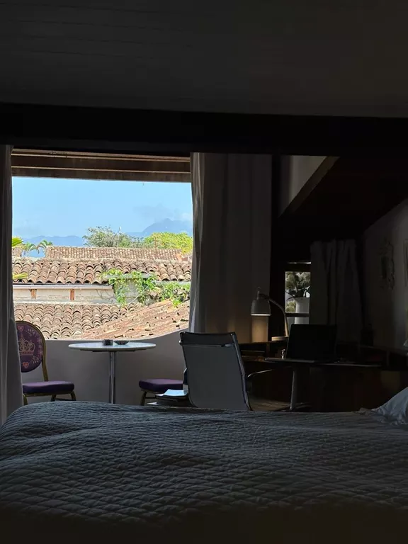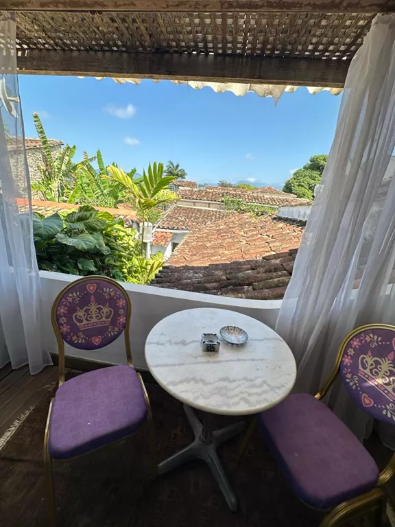 Varanda com janela e vista para as montanhas e para todo o Centro Histórico.