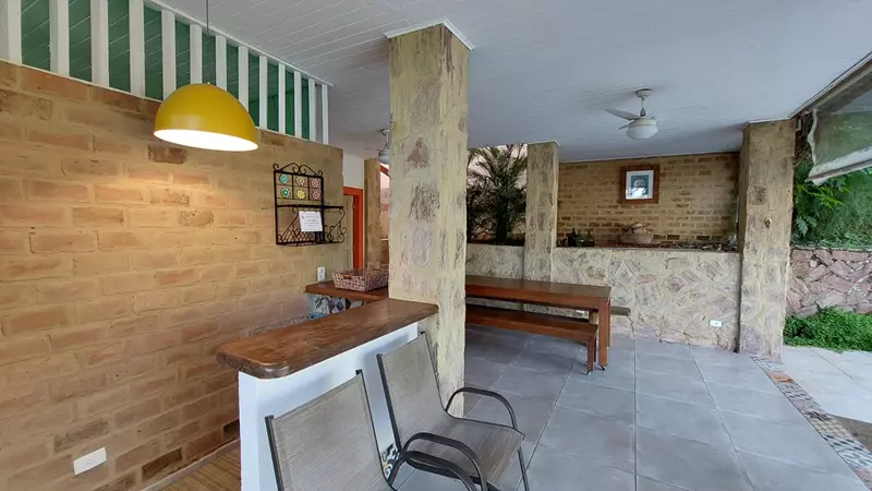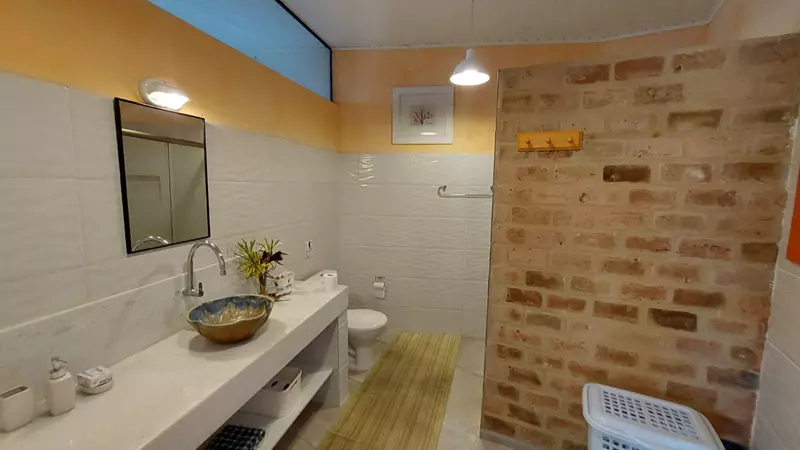 A casa é dividida em dois blocos, o primeiro possui 3 ( três) quartos sendo uma suíte, sala de tv, banheiro e varanda, o segundo possui sala de jantar e cozinha envidraçada com vista panorâmica e uma suíte.
